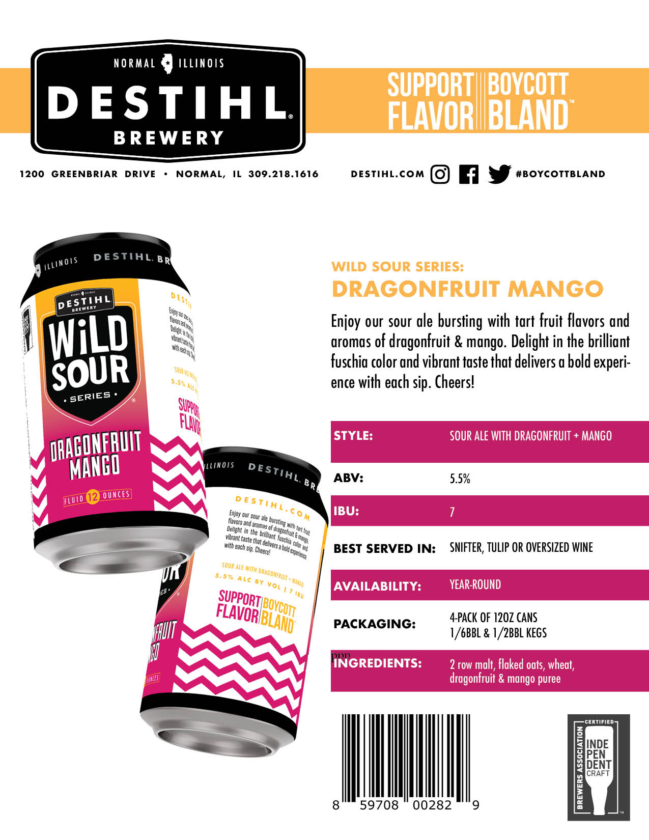 Enjoy our sour ale bursting with tart fruit flavors and aromas of dragonfruit & mango. Delight in the brilliant fuchsia color and vibrant taste that delivers a bold experience with each sip.